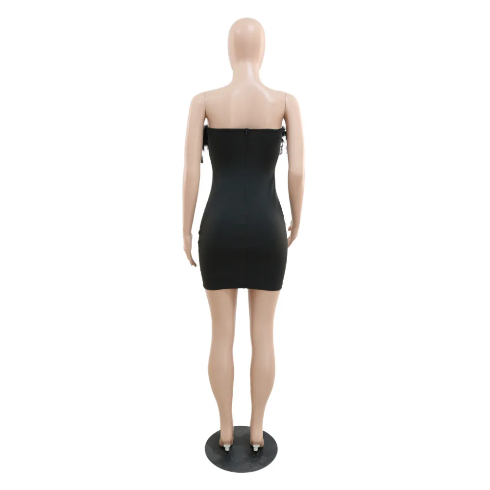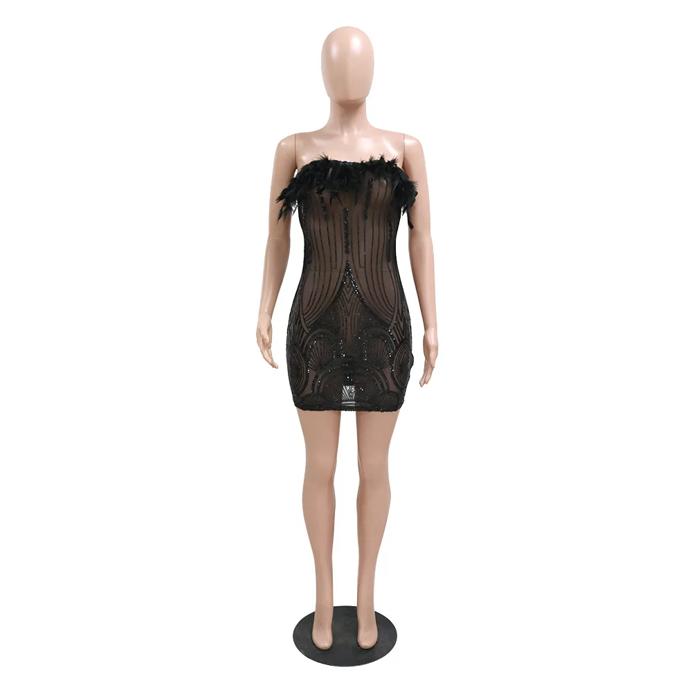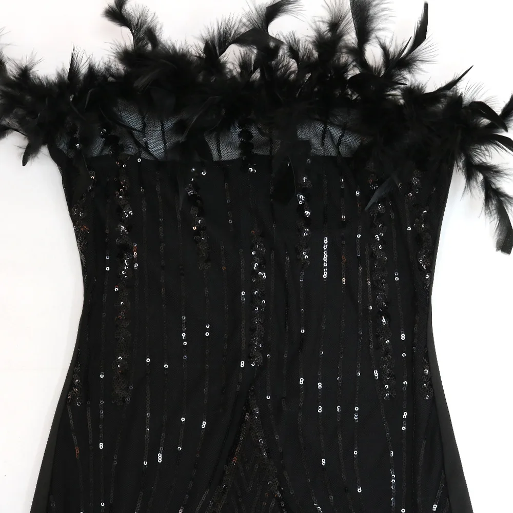iDress Black Sexy Sequin Party Dress for Women Elegant Glitter Feather Short Dress Sheer Mesh Strapless Bodycon Mini Club Dress