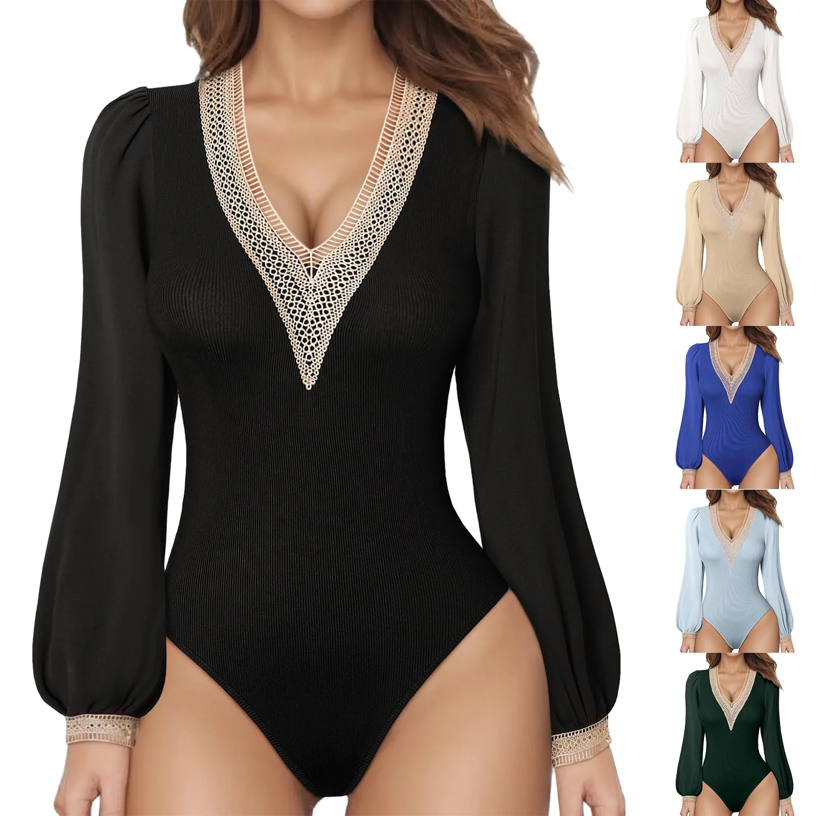 Lace V Neck Bodysuit Blouses Puff Long Sleeves Pullover Fashion Solid Tops Elegant Female Ribbed Body Suit Spring Jumpsuit 2024